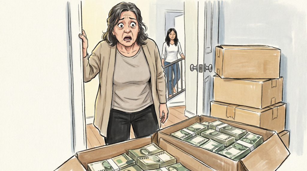I opened the last room and my knees buckled. It was filled with stacks of boxes. Some were open, and inside were bundles of cash tied to the floor. I nodded, my hand trembling. I know he sends 8 million pesos every year. If there’s so much money here, where does it come from? Why is it hidden away in a locked room like a warehouse?